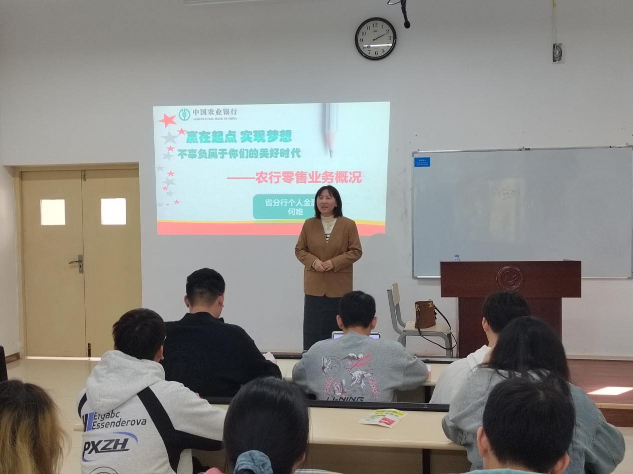 10月23日下午两点,学院2025-2026学年第一学期第五场“农银业务课”授课在J5-211教室顺利开展。本次课程由中国农业银行湖北省分行个人金融部单元经理何唯老师主讲,农银2341班全体同学参加学习。