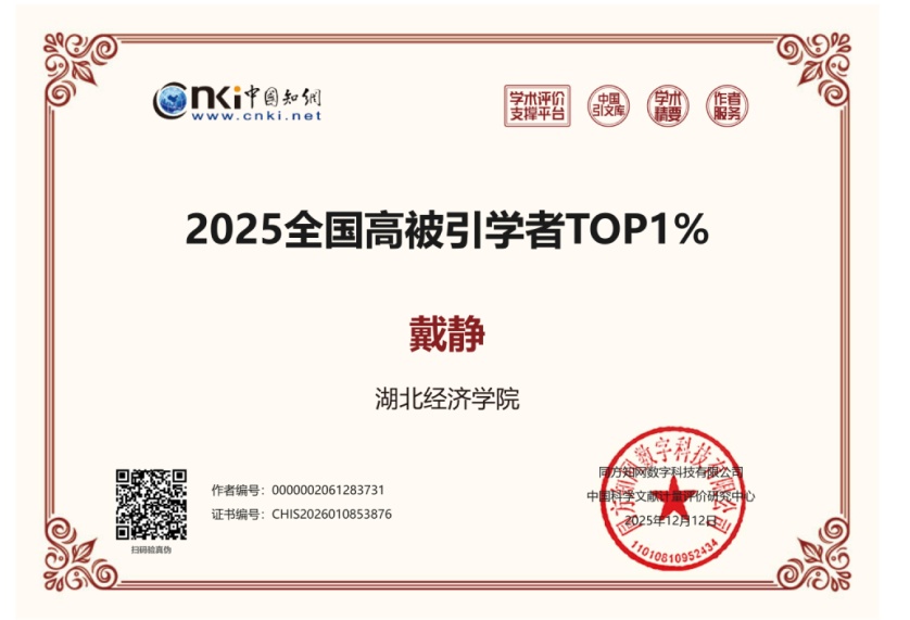 近日,中国知网(CNKI)下属的中国科学文献计量评价研究中心正式发布“2025全国高被引学者”榜单,旨在表彰近十年来国内学术成果丰硕、影响力突出的学者群体。经图书馆学术信息追踪确认,我院共有5名教师光荣上榜,其中戴静副院长入选“中国知网高被引学者Top1%”,许传华、马永健、于寄语、兰晓梅4名教师入选Top5%,彰显了我院在科研领域的卓越实力。(撰稿人:姬姣姣 审核人:戴静)