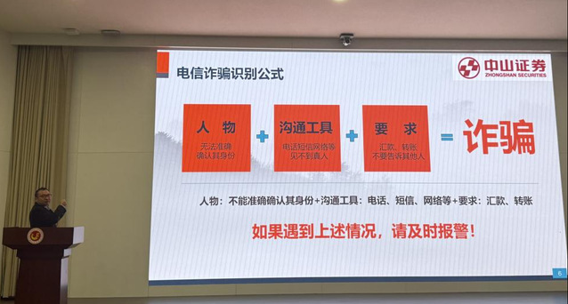 讲座中,朱老师深入浅出地剖析了当前高发的电信诈骗套路,并特别分享了“电信诈骗识别公式”:
