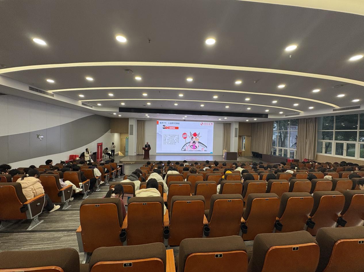 烂漫樱花季,求知正当时!3月15日,计算机金融2541班、金融工程2541班、金融科技2541班和投资2541班新生迎来本学期第一次专业认知实习,学院特邀中山证券投资顾问团队走进大学生活动中心,为学子带来“投资者教育进百校”反诈专题讲座。陈芬老师主持本次讲座,投资顾问朱文波老师深入浅出的讲解,让金融安全的种子悄然在春天播撒。