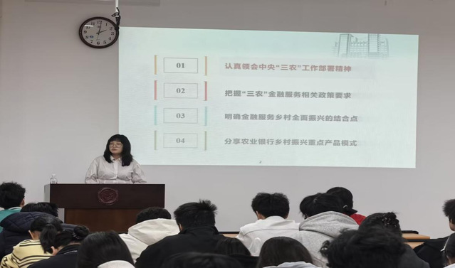 樱花烂漫,学意正浓。4月2日下午,金融学院特邀中国农业银行湖北省分行三农对公业务部专家胡丹老师,为农银2441班、农银2541班、金创2541班学生带来一场题为“解读新时期农村金融发展要求——分享农业银行乡村振兴重点产品模式”的专题讲座。本次活动是金融学院专业认知实习系列的重要组成部分,旨在帮助学生深入了解国家“三农”政策导向,把握当前金融实践中关于农村金融服务的现实路径。