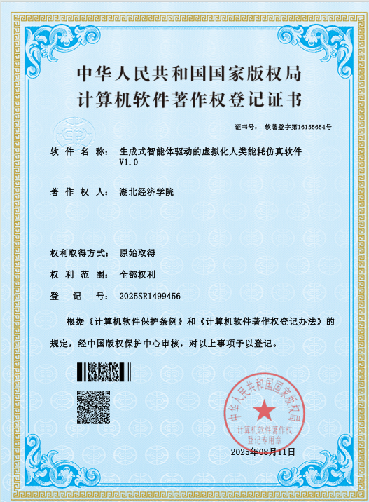 我院金融硕士研究生李彦铎主导研发的“生成式智能体驱动的虚拟化人类能耗仿真软件”近期正式获得中华人民共和国国家版权局颁发的计算机软件著作权登记证书(登记号:2025SR1499456)。李彦铎的指导教师为我院金融硕士研究生导师、校党委副书记付宏教授,该项软著第一作者为李彦铎,合作者为付宏教授、雷帮军教授和余娇娇博士。