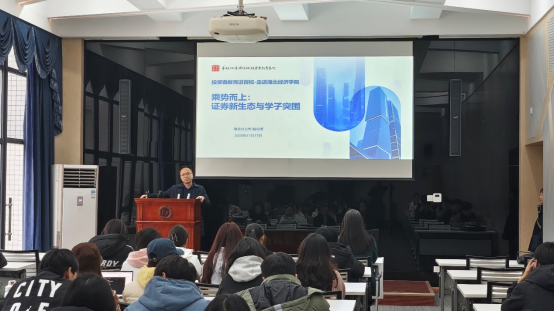 2025年11月17日下午,一场聚焦证券行业前沿动态与职业发展的专题讲座在湖北经济学院金融学院学术报告厅成功举办。华福证券湖北分公司财富部总经理胡志涛先生作为主讲嘉宾,以“乘势而上:证券新生态与学子突围”为题,为现场师生带来精彩分享。金融学院副院长杨申燕教授主持讲座,学院2025级全体金融硕士研究生到场聆听。